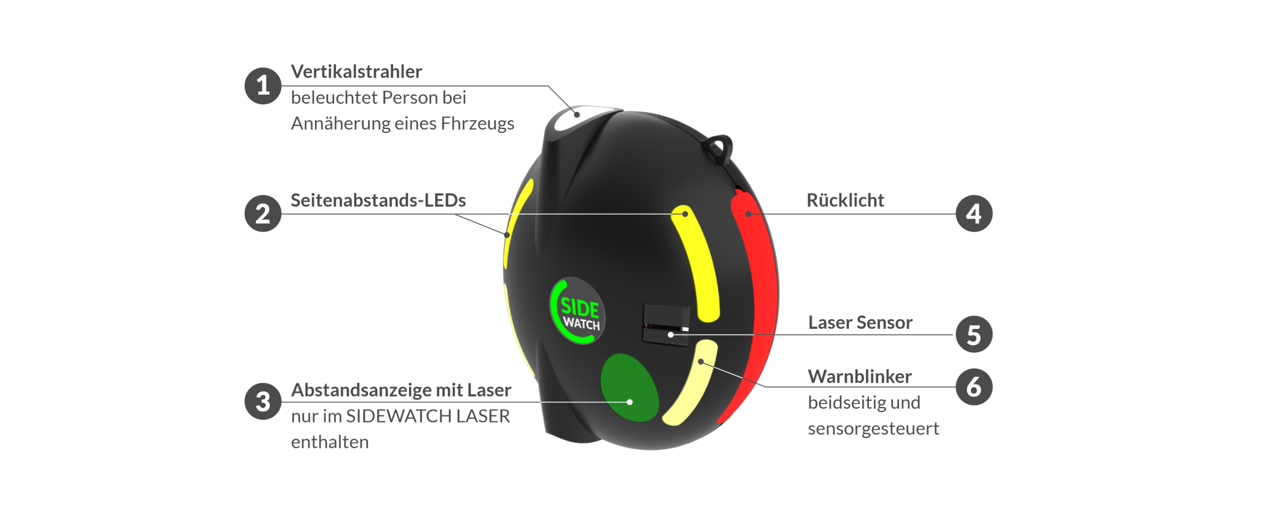 In Deutschland sind jedoch blinkende oder projizierende Warngeräte an Fahrrädern oder Rollern nicht erlaubt, weswegen wir hier nur den SIDEWATCH ohne Laser anbieten.