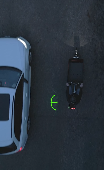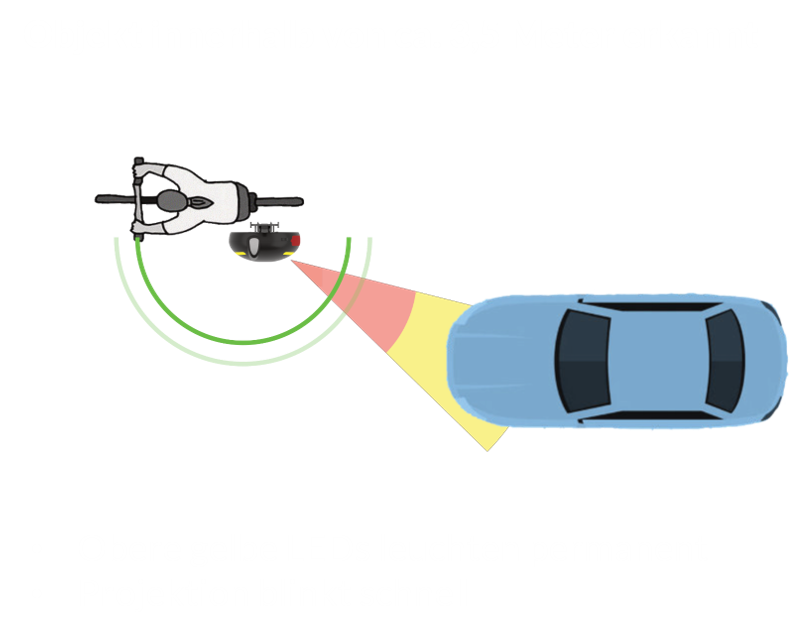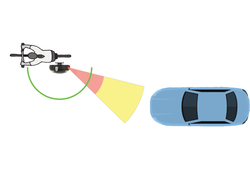 Ein LIDAR Sensor beobachtet ständig eine Zone innerhalb eines Abstands von 4m hinter und seitlich zum Fahrrad oder zur tragenden Person.