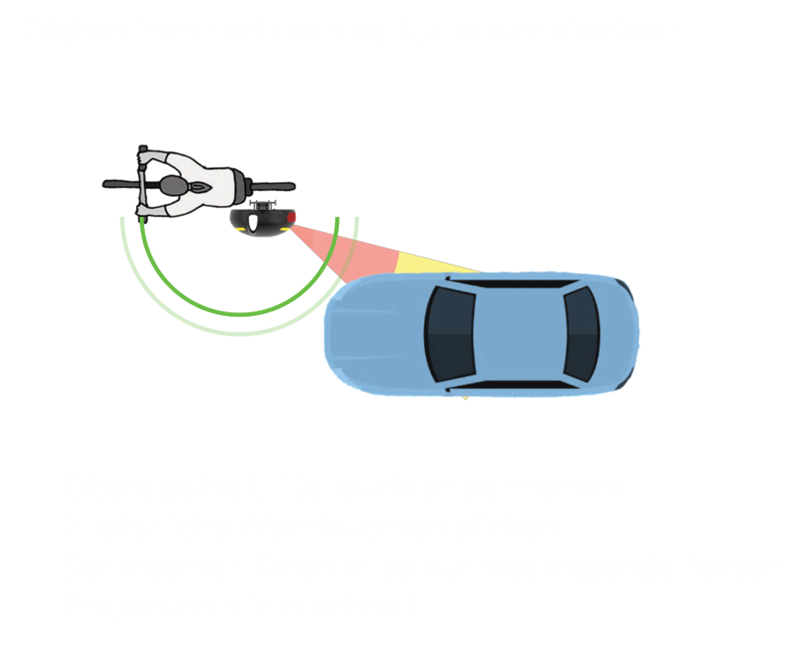 Bei Annäherung eines Fahrzeugs wird die tragende Person angeblinkt, um sicherzustellen, dass sie im überholenden Fahrzeug gesehen wird.