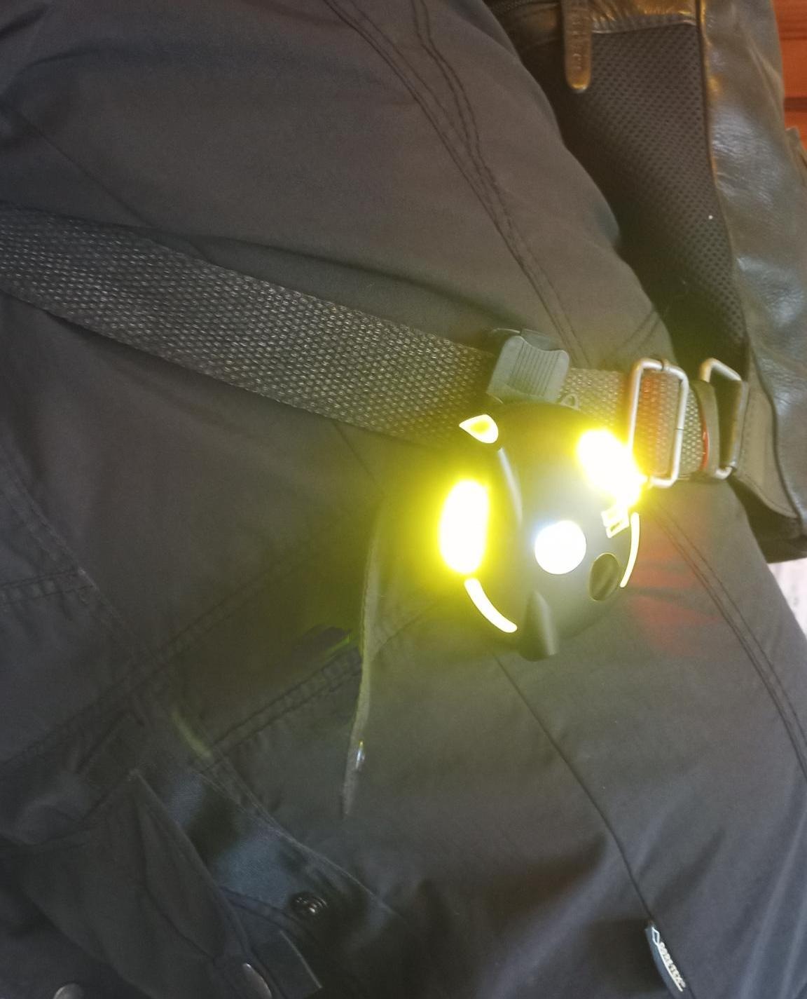 Taghelle gelbe LEDs, die ständig leuchten, lenken die Aufmerksamkeit auf die tragende Person, auch wenn sie nicht extern angestrahlt wird.